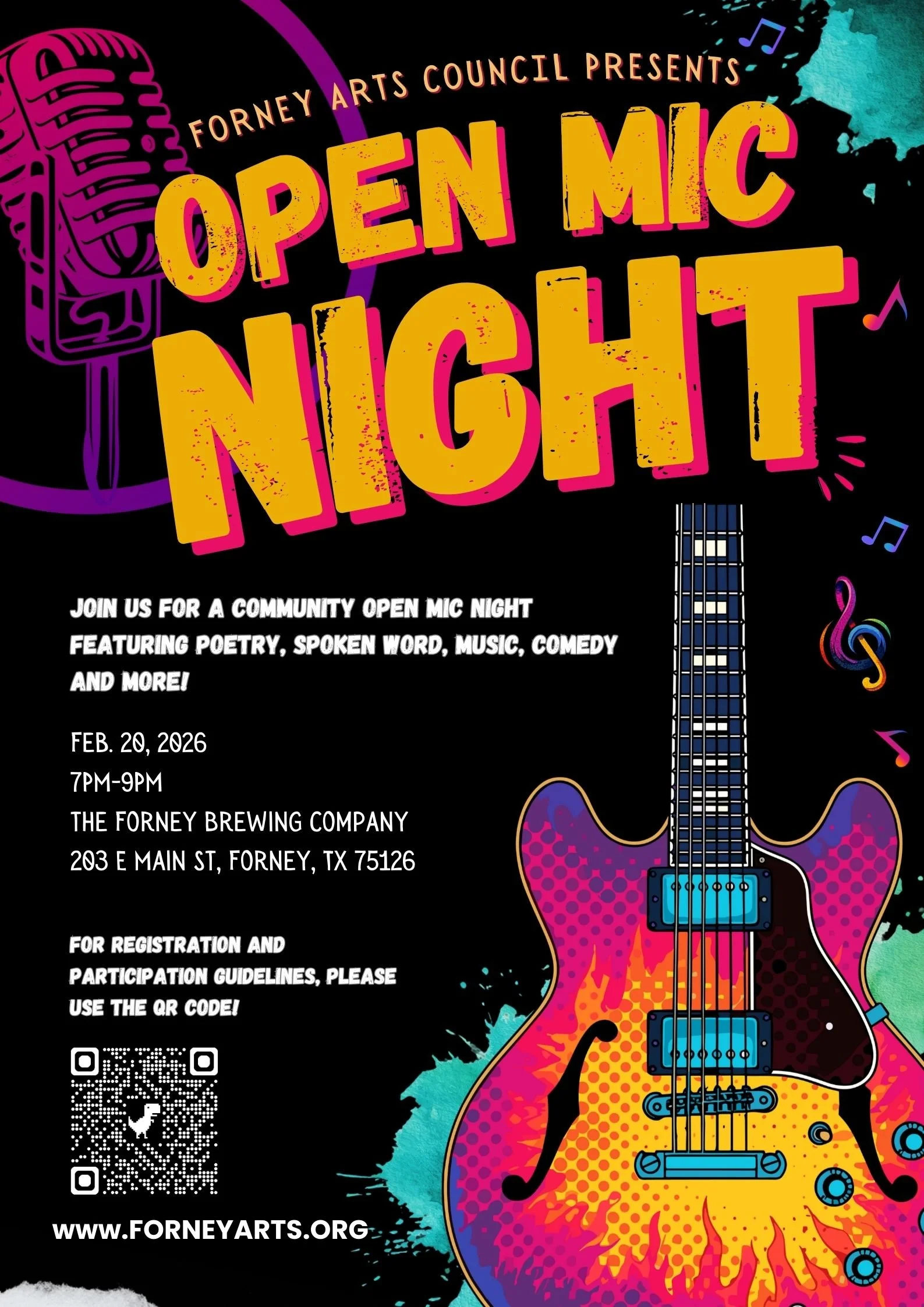 Slots will be given out day-of. The lineup will be posted at the Forney Brewing Company and emailed to performers if email is provided.